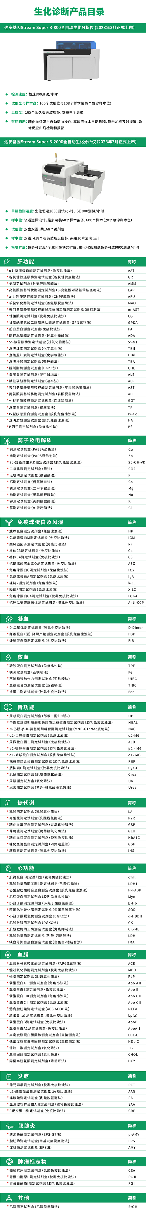 达泰生物现在已获证的生化试剂涵盖各类肝功能、离子及电解质、免疫球蛋白及风湿、凝血、贫血、肾功能等总计114项,配套的全自动生化分析仪也即将上市,以下是生化诊断产品目录: