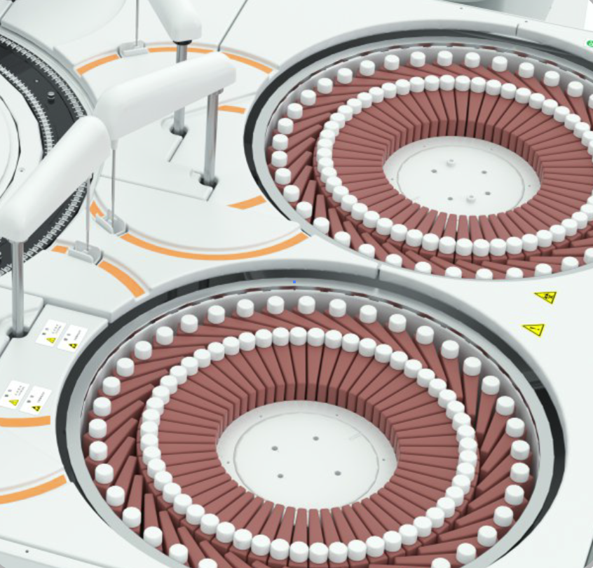 加样针独立非同步进行,有效提升测试速度,双盘设计,共有168个试剂位,单盘故障时不影响另一个盘的正常运行。