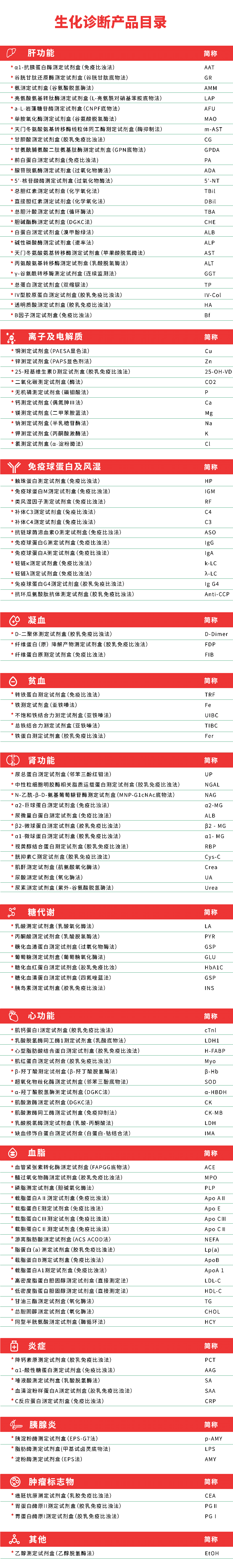 此外,盛煌娱乐之梦基因现在已获证的配套生化试剂涵盖肝功能、肾功能、心功能、离子及电解质、免疫球蛋白及风湿、凝血、贫血等总计114项,试剂性能优越,品类丰富,备货充足。以下是生化诊断试剂产品目录: